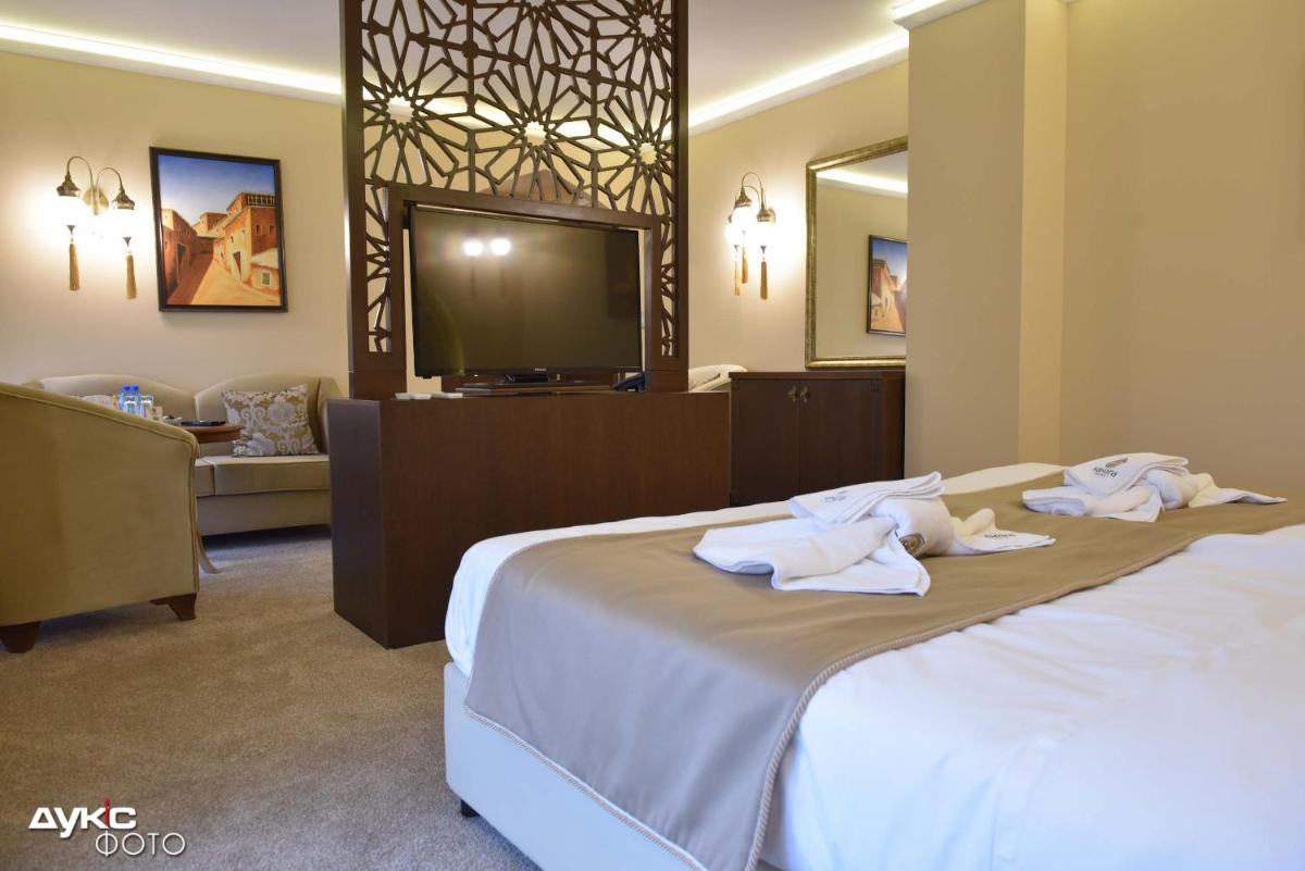O Sahara Hotel da SVilenGrad oferece uma estadia confortável perto do rio Ardas, oferecendo comodidades convenientes, como bicicletas gratuitas, estacionamento privado, um jardim e um lounge compartilhado. Os hóspedes podem desfrutar de um bar e acesso a uma troca de moeda. Os quartos apresentam ar condicionado, uma área de estar, uma TV de tela plana com canais de satélite, um banheiro seguro e privado equipado com um bidet, produtos de higiene pessoal grátis e um secador de cabelo. O hotel também inclui serviço de quarto, uma recepção de 24 horas e uma variedade de instalações de bem-estar, incluindo uma sauna e um hammam. Convenientemente situado a 47 km da mesquita Selimiye, o hotel oferece proximidade a várias atrações, tornando -a a escolha ideal para os viajantes que procuram uma estadia relaxante e confortável.